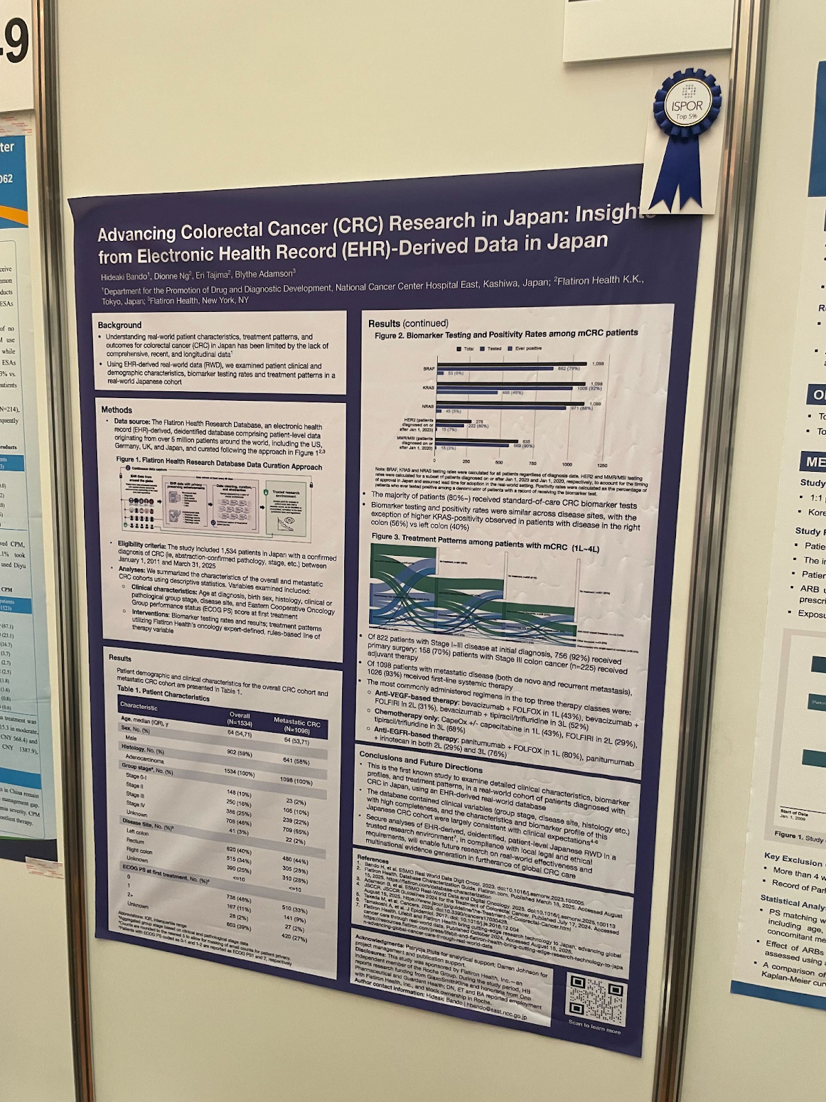 2025年9月28日(日)〜30日(火)に東京で開催された「ISPOR Real-World Evidence Summit 2025」にて、国立がん研究センター東病院と当社で共同で実施した研究「Advancing Colorectal Cancer (CRC) Research in Japan: Insights from Electronic Health Record (EHR)-Derived Data in Japan」 を発表いたしました。国立がん研究センター東病院 医薬品開発推進部 部長 坂東 英明先生を筆頭著者として、ポスター発表として報告しました。