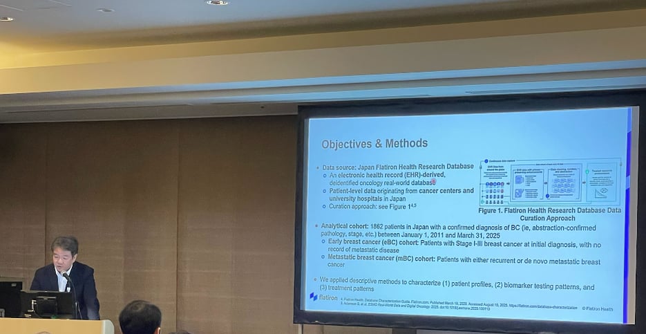 当日は、国立がん研究センター東病院 総合内科科長 内藤 陽一先生により、国内における乳がん患者のバイオマーカー検査率や陽性率の現状、ならびに早期乳がんおよび転移性乳がんにおけるHR/HER2サブタイプごとの実臨床下での治療傾向について、当社が日本で構築している電子カルテ由来のがんリアルワールドデータ(RWD)を用いた解析結果を発表いたしました。
